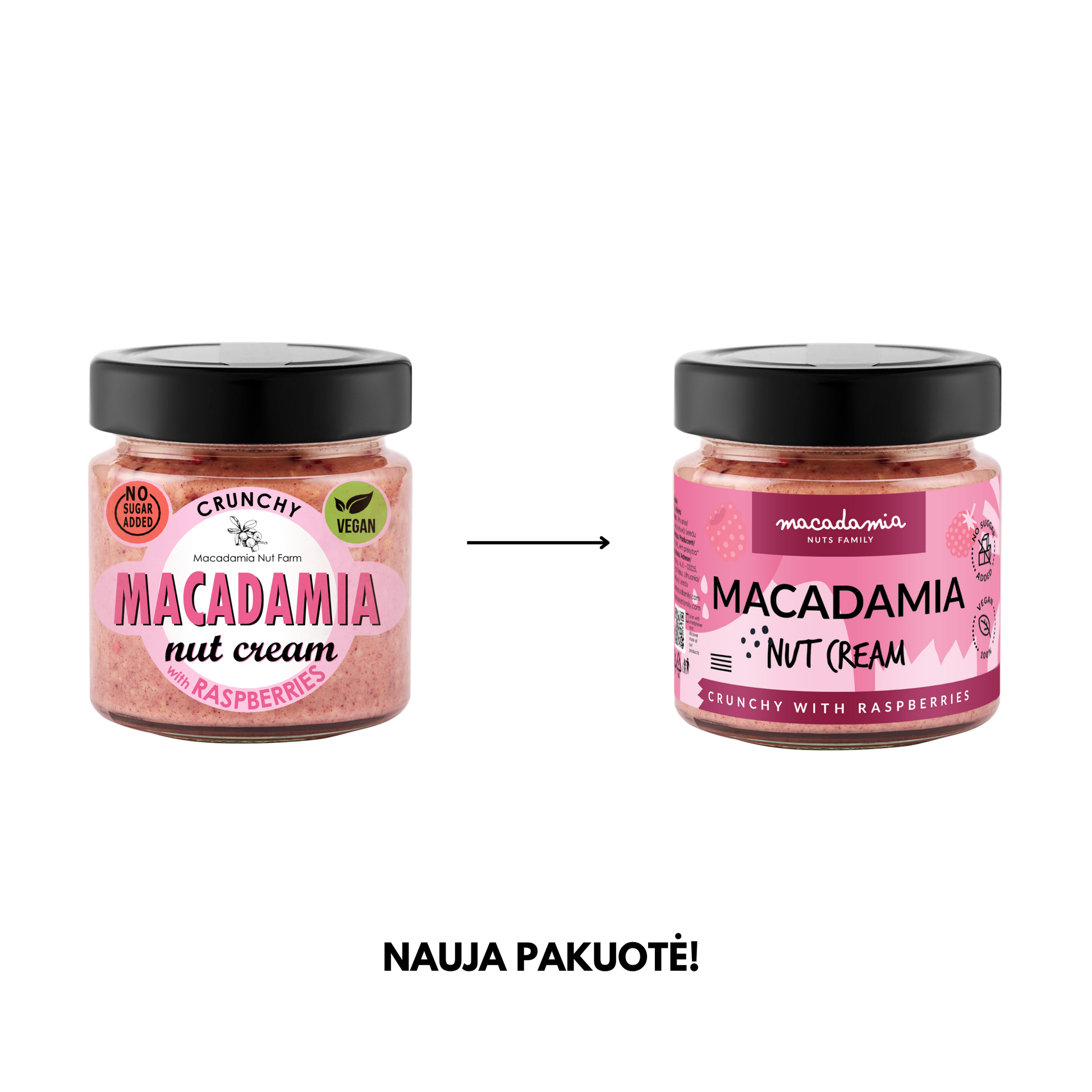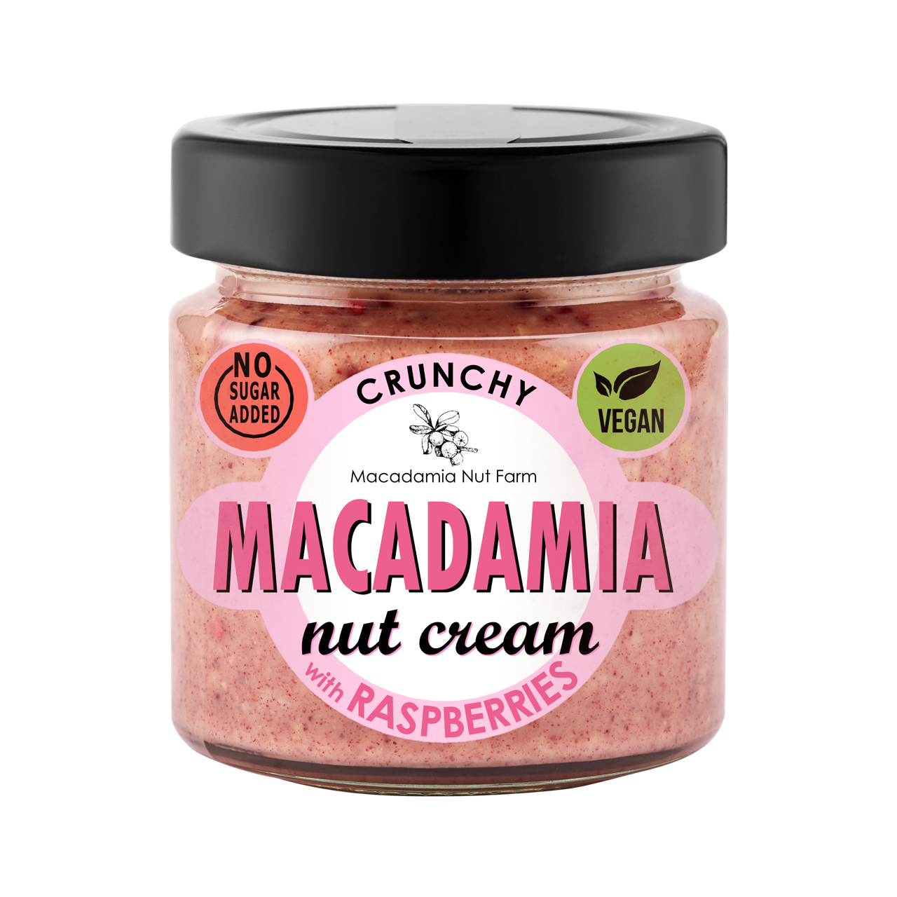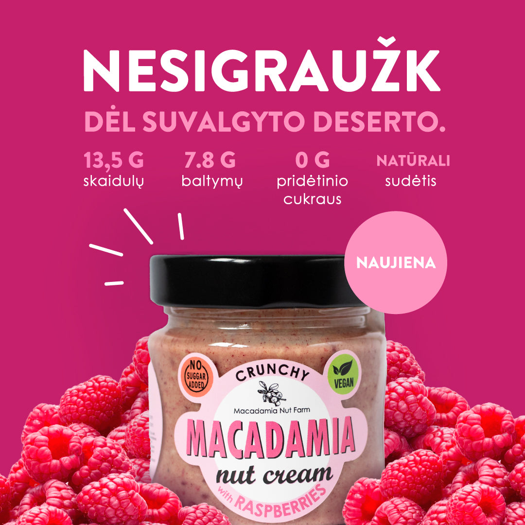 Traškus, švelnaus skonio makadamijos riešutų ir aviečių derinys, kuriam neatsispirs nei vaikai, nei smaližiai! Pažadame LABAI DAUG aviečių gabaliukų!