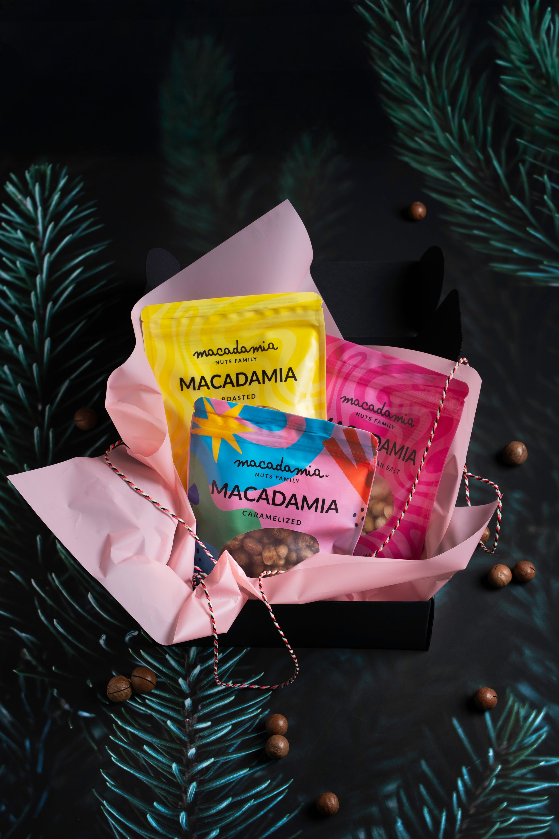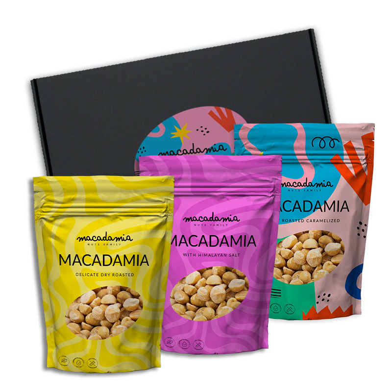Trijų rūšių makadamijų riešutai - tikras degustacijos rinkinys smaližiams.